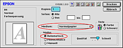 Wählen Sie Normalpapier als Einstellung für Medium und Automatisch als Einstellung für Modus.