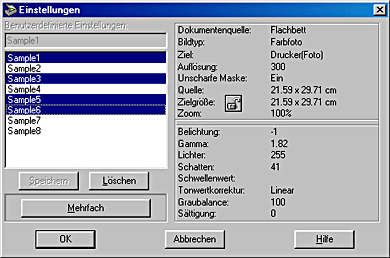 Zum Scannen eines einzelnen Bildes mit verschiedenen Einstellungen, erstellen und speichern Sie jede Einstellungsgruppe wie nachfolgend beschrieben. Halten Sie dann die Strg-Taste gedrückt und klicken Sie auf die benutzerdefinierten Einstellungen, die Sie in der Liste Benutzerdefinierte Einstellungen auswählen wollen. Nachdem Sie alle gewünschten Einstellungen ausgewählt haben, klicken Sie auf Batch Scan. Das Gerät scannt das Bild ein Mal für jede von Ihnen ausgewählte Einstellungsgruppe.