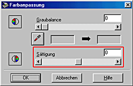 ![]() | Bewegen Sie den Schieberegler Sättigung nach links oder rechts, oder geben Sie einen Wert zwischen -100 (geringste Farbdichte) und 100 (höchste Farbdichte) ein. |