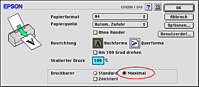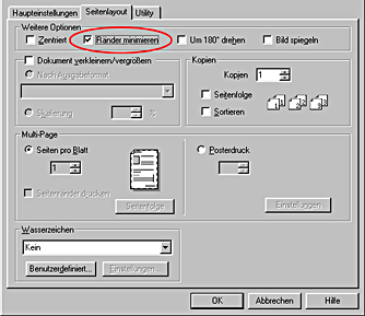 Wenn Sie den Druckbereich in der Druckersoftware mit dem Kontrollkästchen Ränder minimieren unter Weitere Optionen (Windows) oder mit der Option Maximal unter Druckbereich (Macintosh) angegeben haben, kann die abgeschnittene Ecke des Spezialpapiers den Ausdruck beeinträchtigen.