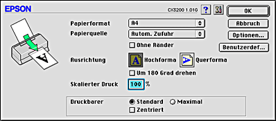 Im Dialogfenster Papierformat können Sie das Papierformat ändern, die Papierausrichtung festlegen, die Vorlage um 180 Grad drehen, den skalierten Ausdruck festlegen und den Druckbereich einstellen.