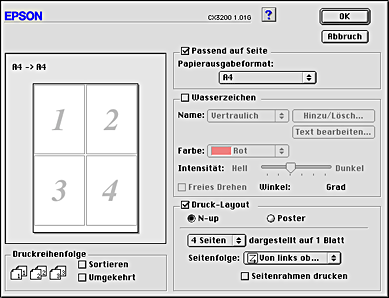 Hier können Sie die Reihenfolge festlegen, in der die Seiten auf das Einzelblatt gedruckt werden. |
