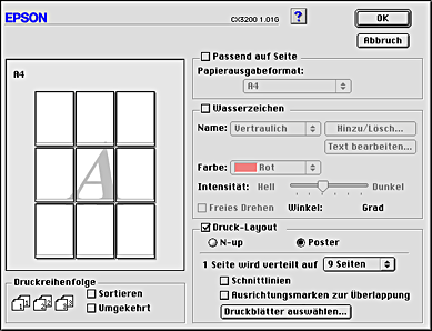 Durch Markieren des Kontrollkästchens Druck-Layout können Sie zwischen den Einstellungen N-up und Poster wählen. Näheres finden Sie jeweils im entsprechenden Abschnitt weiter unten.