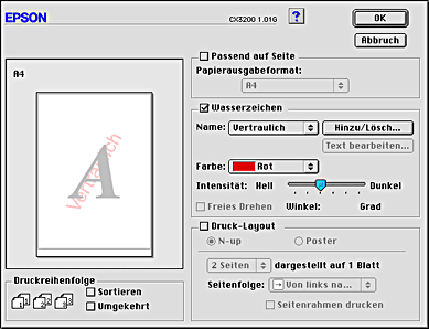 Über das Dialogfenster Seitenlayout können Sie die Dokumentengröße automatisch an das Papierformat anpassen, zwei bzw. vier Seiten auf einem Blatt ausdrucken, im Posterformat ausdrucken (eine Seite so weit vergrößern, dass sie auf mehrere Blätter gedruckt wird), Dokumente mit Wasserzeichen versehen oder die Seitenfolge für Ihren Druckauftrag verändern. Näheres finden Sie jeweils im entsprechenden Abschnitt weiter unten.