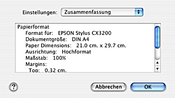 Im Dialogfenster Papierformat können Sie, wenn Sie die Option Zusammenfassung unter Einstellungen gewählt haben, die aktuellen Einstellungen in diesem Dialogfenster überprüfen.