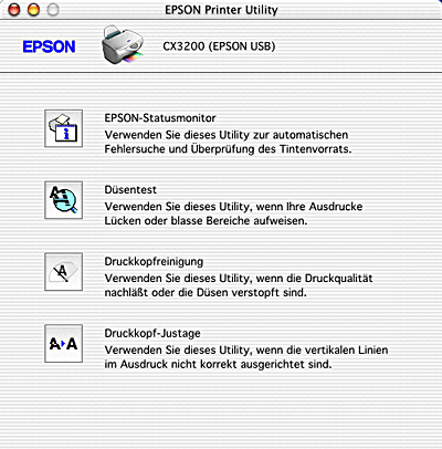 Zum Verwenden der Utilities doppelklicken Sie auf das Symbol EPSON Drucker-Utility im Ordner Programme in Macintosh HD (in der Standardeinstellung) und klicken Sie dann auf die Schaltfläche des Utility, das Sie verwenden möchten.