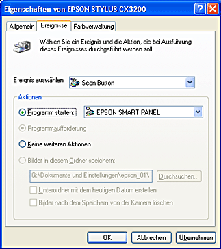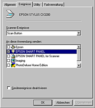 außer dem EPSON SMART PANEL eine beliebige andere Anwendung, die "Scannerereignisse" unterstützt (z. B. Microsoft Imaging für Windows, sofern diese installiert ist), unter Windows zuweisen. Wenn Sie die Taste Scannen
