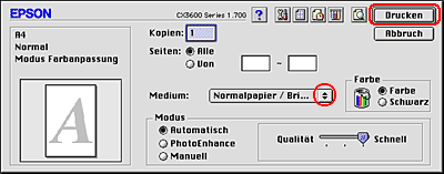 Nehmen Sie die erforderlichen Einstellungen für Medium, Farbe und Modus vor.