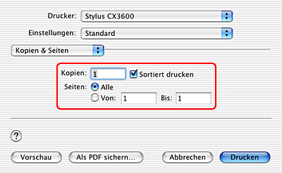 Nehmen Sie die Einstellung für Drucker entsprechend der Einstellung für Format für vor, die Sie in Schritt 3 im Dialogfeld Papierformat vorgenommen haben. Nehmen Sie dann die Einstellungen für Kopien & Seiten vor.