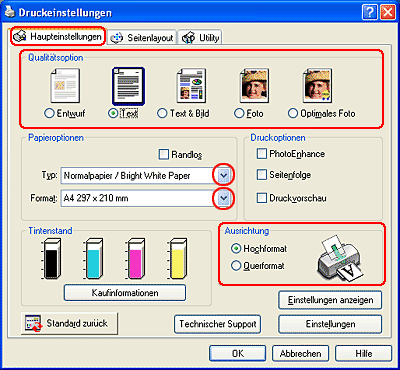 ![]() | Klicken Sie auf die Registerkarte Haupteinstellungen und nehmen Sie die Einstellungen für Qualitätsoptionen vor. Nähere Informationen finden Sie in der Online-Hilfe. |