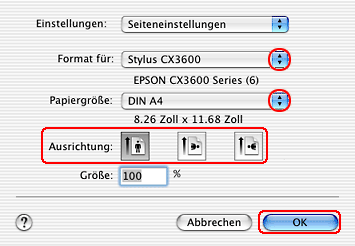 ![]() | Nehmen Sie die erforderlichen Einstellungen für Papierformat und Ausrichtung vor. |