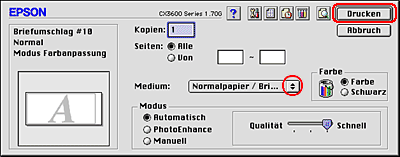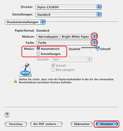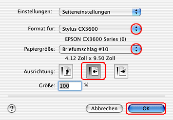 ![]() | Wählen Sie Stylus CX3600 als Einstellung für Format für. |