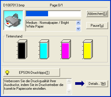 Das Dialogfeld mit dem Fortschrittsbalken wird automatisch angezeigt, wenn Sie einen Druckauftrag an dieses Gerät übertragen. Von diesem Dialogfeld aus können Sie die verbleibende Tintenmenge kontrollieren.