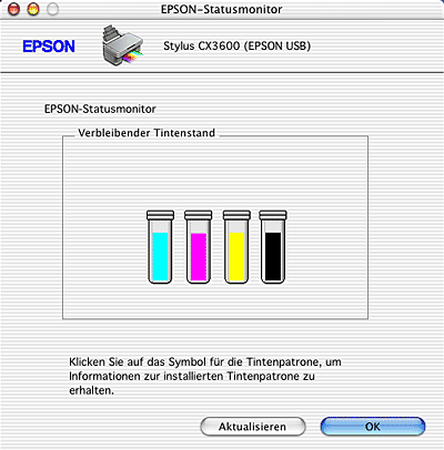 Auf der grafischen Anzeige wird die verbliebene Tintenmenge zum Zeitpunkt des Öffnens des EPSON StatusMonitor angezeigt. Um die Tintenstandinformationen zu aktualisieren, klicken Sie auf Aktualisieren.