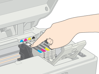 Wenn die Abdeckung des Wagens sich nicht schließt oder der Druckkopfwagen nicht in seine Ruhestellung verfährt, öffnen Sie die Wagenabdeckung und drücken Sie die Tintenpatronen nach unten, sodass sie einrasten.