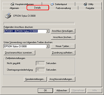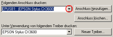 Wenn EPUSBX: (EPSON Stylus CX3600) im Listenfeld An folgendem Anschluss drucken angezeigt wird, sind der USB-Druckertreiber und die Druckersoftware richtig installiert. Wenn der korrekte Anschluss nicht angezeigt wird, fahren Sie mit dem nächsten Schritt fort.