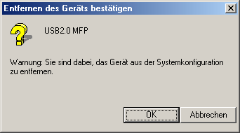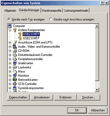 Klicken Sie unter Sonstige Geräte auf USB MFP oder EPSON Stylus CX3600 und klicken Sie dann auf Entfernen. Klicken Sie dann auf OK.