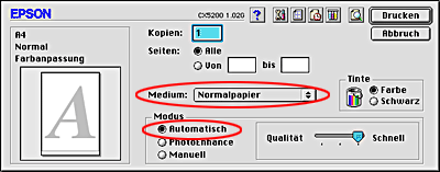 Wählen Sie Normalpapier als Einstellung für Medium und Automatisch als Einstellung für Modus.