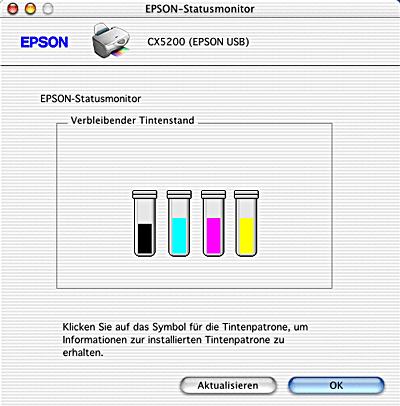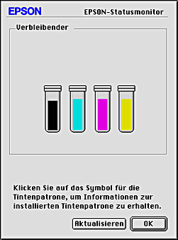 Sie können dieses Utility auch verwenden, um den Tintenstand vor dem Drucken zu überprüfen. Wenn der EPSON-StatusMonitor geöffnet ist, zeigt er den Status der verbleibenden Tintenmenge zum Zeitpunkt des Öffnens an. Um die Tintenstandinformationen zu aktualisieren, klicken Sie auf die Schaltfläche Aktualisieren.