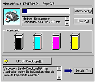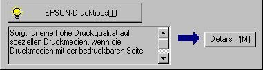 In einem Textfeld unten im Dialogfenster des Fortschrittsbalkens erscheinen Tipps, wie Sie die EPSON-Druckersoftware optimal einsetzen können. Alle 30 Sekunden erscheint ein neuer Tipp. Wenn Sie mehr Informationen zum angezeigten Tipp wünschen, klicken Sie auf die Schaltfläche Details.