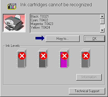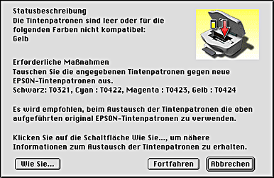 Wenn eine Tintenpatrone fast oder völlig leer ist, erscheint die Schaltfläche Wie Sie unter dem Textfeld. Klicken Sie auf Wie Sie, und der EPSON-Statusmonitor3 gibt Ihnen Schritt-für -Schritt Anweisungen zum Austauschen der Tintenpatrone.