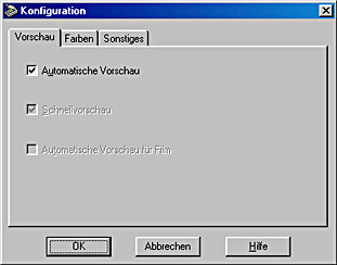 Klicken Sie auf die Schaltfläche Konfiguration, um das Dialogfeld Konfiguration aufzurufen. In diesem Dialogfeld können Sie eine Vielzahl Konfigurationseinstellungen zu dem Vorschaufenster, dem Vorschaubild und der Farbanpassung vornehmen.