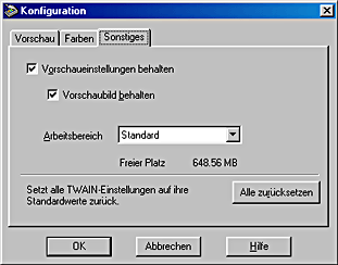 Wenn Sie dieses Kontrollkästchen aktivieren, wird das im Vorschaufenster angezeigte Bild zusammen mit den entsprechenden Einstellungen gespeichert, so dass es beim nächsten Start von EPSON TWAIN noch zur Verfügung steht. Diese Funktion ist nützlich, wenn Sie dieselbe Vorlage mehrfach scannen wollen. Besonders hilfreich ist diese Funktion, wenn Sie verschiedene TWAIN-kompatible Anwendungen für das Scannen derselben Vorlage nutzen.