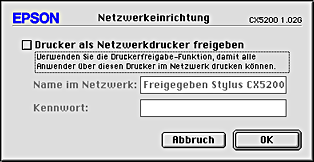 Wählen Sie das Kontrollkästchen Drucker als Netzwerkdrucker freigeben und geben Sie dann entsprechend den Druckernamen und das Kennwort ein.