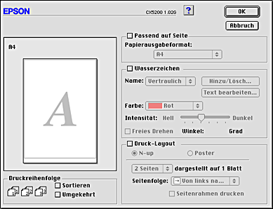 Über das Dialogfenster Layout können Sie die Dokumentengröße automatisch an das Papierformat anpassen, zwei bzw. vier Seiten auf einem Blatt ausdrucken, im Posterformat ausdrucken (eine Seite so weit vergrößern, dass sie auf mehrere Blätter gedruckt wird), Dokumente mit Wasserzeichen versehen oder die Seitenfolge für Ihren Druckauftrag verändern. Näheres finden Sie jeweils im entsprechenden Abschnitt weiter unten.