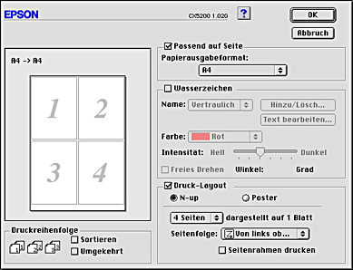 Hier können Sie die Reihenfolge festlegen, in der die Seiten auf das Einzelblatt gedruckt werden. |