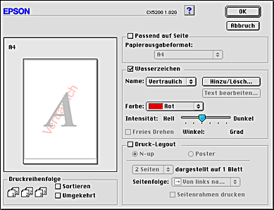 Um ein Wasserzeichen auf Ihr Dokument zu drucken, wählen Sie im Dialogfenster Layout das Kontrollkästchen Wasserzeichen aus.