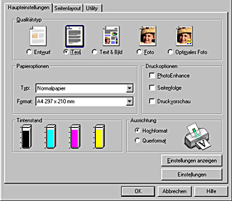 Im Hauptmenü können Sie die Qualitätstyp, Papieroptionen, Druckoptionen, Ausrichtung und Erweiterte Einstellungen vornehmen sowie die Tintenstand abrufen. Näheres finden Sie jeweils im entsprechenden Abschnitt weiter unten.