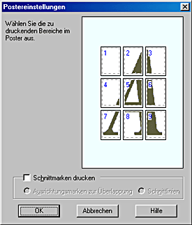 Wenn Sie nur einzelne Blätter und nicht das ganze Poster drucken möchten, klicken Sie auf die Blätter, die Sie nicht drucken möchten, und anschließend auf OK, um das Dialogfeld Postereinstellungen zu schließen.