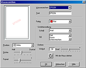 Stellen Sie sicher, dass Sie das gewünschte Wasserzeichen im Listenfeld Wasserzeichen ausgewählt haben, und führen Sie dann die Einstellungen für Farbe, Position, Dichte, Größe, Schriftart, Schriftstil und Winkel durch. (Nähere Informationen finden Sie in der Online-Hilfe.) Die von Ihnen gewählten Einstellungen werden links im Dialogfeld angezeigt.