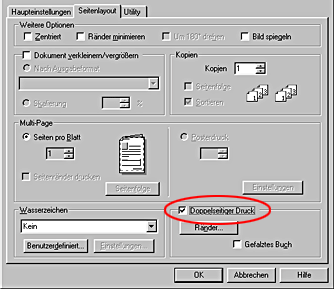 Markieren Sie auf der Registerkarte Seitenlayout das Kontrollkästchen Doppelseitiger Druck. Weitere Informationen zum Aufrufen der Registerkarte Seitenlayout erhalten Sie unter Druckersoftware aufrufen.