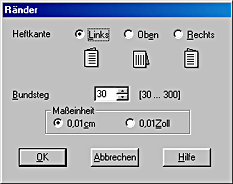 Der tatsächliche Bundsteg kann entsprechend der anwendungs-spezifischen Einstellungen variieren. Drucken Sie erst einige Testseiten aus, bevor Sie den gesamten Druckauftrag starten.