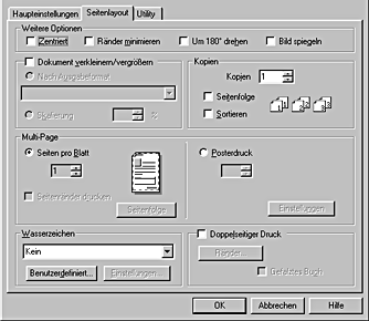 Unter Multi-Page können Sie zwischen den Optionen Seiten pro Blatt und Posterdruck wählen. Näheres finden Sie jeweils im entsprechenden Abschnitt weiter unten.