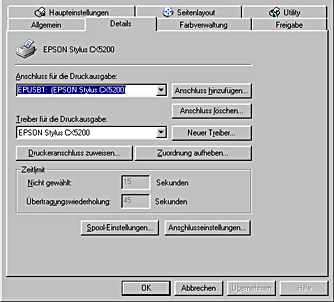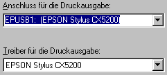 Wenn EPUSBX: (EPSON Stylus CX5200) im Listenfeld An folgendem Anschluss drucken angezeigt wird, sind der USB-Druckertreiber und die Druckersoftware korrekt installiert. Wenn der korrekte Anschluss nicht angezeigt wird, fahren Sie mit dem nächsten Schritt fort.