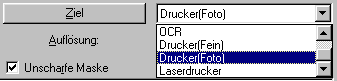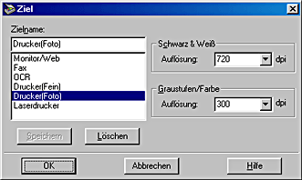 Die Schaltfläche Ziel öffnet das Dialogfeld Ziel, in welchem Sie die Einstellung der Optionen Auflösung und Unscharfe Maske ändern können. Ferner können Sie, wie nachfolgend beschrieben, die benutzerdefinierten Einstellungen der Liste der Ziele hinzufügen.