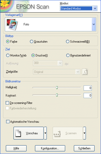 EPSON Scan startet die Vorschau und erkennt die Dokumentenquelle und die Vorlagenart.