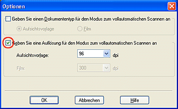 Markieren Sie das Kontrollkästchen. Geben Sie eine Auflösung für den Modus zum vollautomatischen Scannen an.