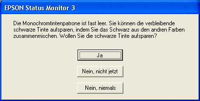 Wenn Sie auf die Schaltfläche Nein, überhaupt nicht klicken, wird die schwarze Tinte ganz normal weiterhin verwendet. Dann wird das Dialogfeld für die restliche Nutzungsdauer der schwarzen Tintenpatrone nicht mehr angezeigt. In diesem Fall wird die schwarze Tinte normal verwendet, bis die Tintenpatrone leer ist.