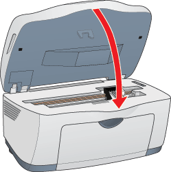 Setzen Sie die Tintenpatrone senkrecht in den dafür vorgesehenen Tintenpatronenhalter ein. Drücken Sie die Tintenpatrone dann vorsichtig nach unten, bis diese hörbar einrastet.
