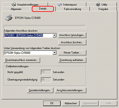Wenn EPUSBX: (EPSON Stylus CX5400) im Listenfeld An folgendem Anschluss drucken angezeigt wird, sind der USB-Druckertreiber und die Druckersoftware richtig installiert. Wenn der korrekte Anschluss nicht angezeigt wird, fahren Sie mit dem nächsten Schritt fort.