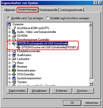Wenn die Treiber korrekt installiert sind, erscheint die Option EPSON USB-Drucker im Menü Geräte-Manager.