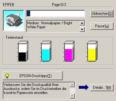 Mit Hilfe des Fortschrittsbalkens oder des EPSON Spool Managers ist es möglich, den laufenden Druckauftrag abzubrechen. Näheres finden Sie jeweils im entsprechenden Abschnitt weiter unten.