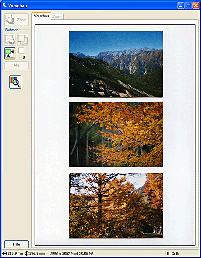 Wenn die Ausgabegröße des gescannten Bildes bereits feststeht, wählen Sie eine entsprechende Einstellung aus der Liste Zielgröße aus. Ein Laufrahmen proportional zu den Maßangaben für Zielgröße wird im Vorschaufenster eingeblendet. Sie können diesen Laufrahmen zu dem Bildbereich, den Sie scannen möchten, verschieben. Nähere Informationen finden Sie in der Online-Hilfe.