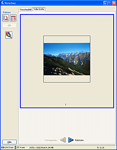 Mit der Vorschau-Methode Normal werden das gesamte Vorschaubild und die Auswirkungen Ihrer Einstellungen angezeigt. Darüber hinaus können Sie weitere Bildeinstellungen vornehmen. Außerdem können Sie Bereiche eines Bilds mit Laufrahmen auswählen. Einzelheiten über Laufrahmen finden Sie unter Laufrahmen verwenden.