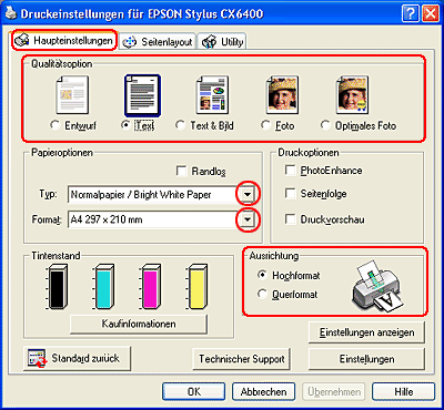 ![]() | Nehmen Sie die erforderlichen Einstellungen für Format für vor. Wählen Sie Stylus CX6400 zum Drucken mit Standardrändern. |