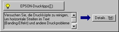 In einem Textfeld unten im Dialogfeld des Fortschrittsbalkens erscheinen Tipps, wie Sie die EPSON-Druckersoftware optimal einsetzen können. Alle 30 Sekunden erscheint ein neuer Tipp. Wenn Sie mehr Informationen zum angezeigten Tipp wünschen, klicken Sie auf die Schaltfläche Details.
